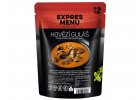 Libové kousky jeleního masa dušené doměkka v omáčce na cibulovém základu se sladkou paprikou, podlité taženým vývarem, dochucené česnekem a jalovcem. Jedna porce.