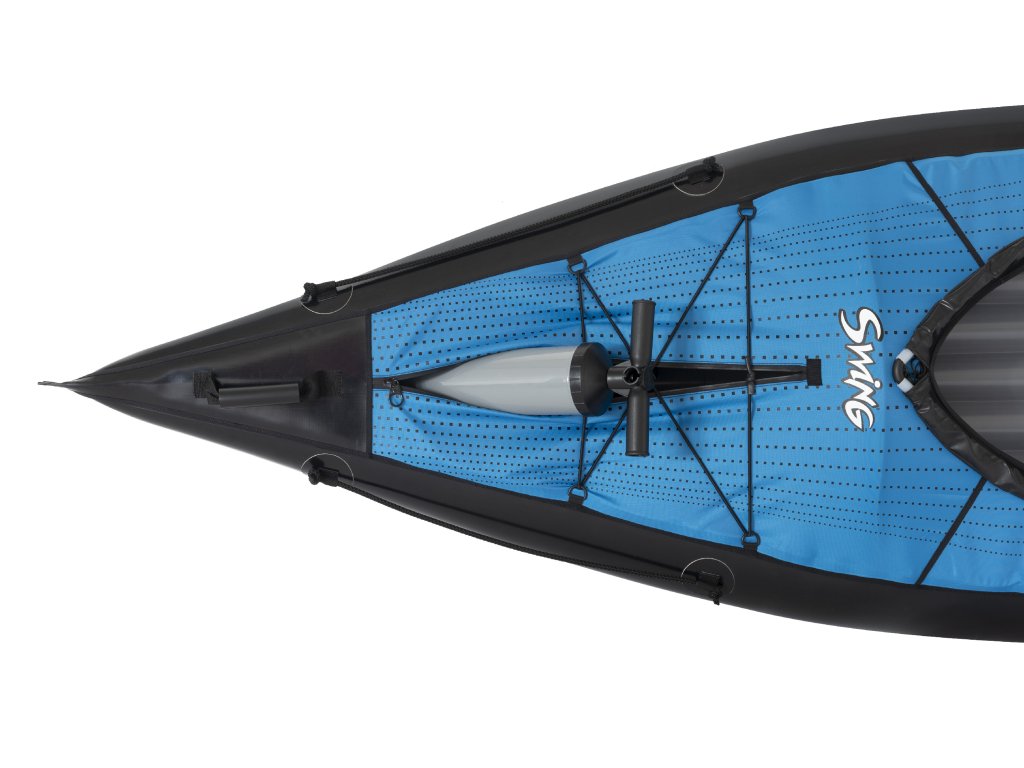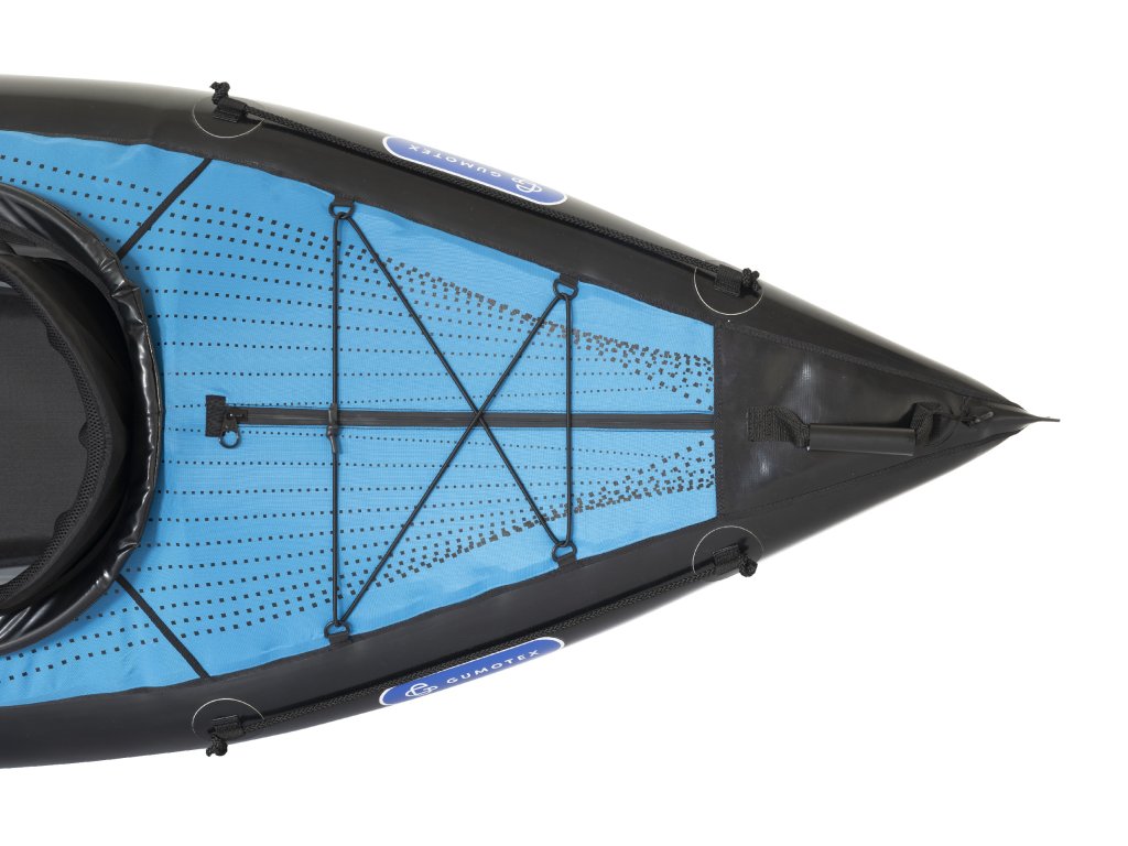 Kajak má systém výztuh, které mu dodávají pevnost. Nízká hmotnost usnadňuje přepravu.