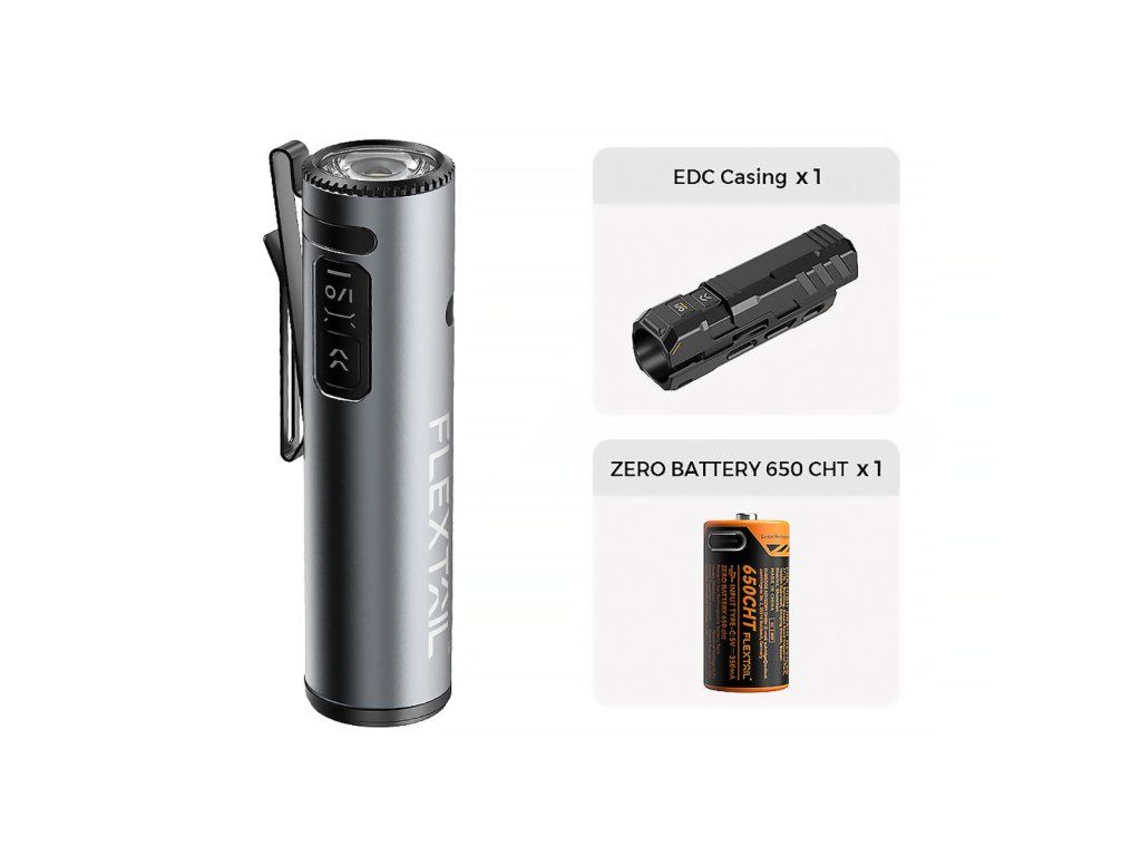 Flextail Zero Flashlight představuje funkční minimum pro každého, kdo hledá vysoký světelný výkon v kapesním balení. Tělo je vyrobeno z hliníkové slitiny, což zajišťuje dobrou mechanickou odolnost při zachování nízké hmotnosti. Tato verze je doplněna o odolné EDC pouzdro, které svítilnu chrání před nárazy při transportu a používání.