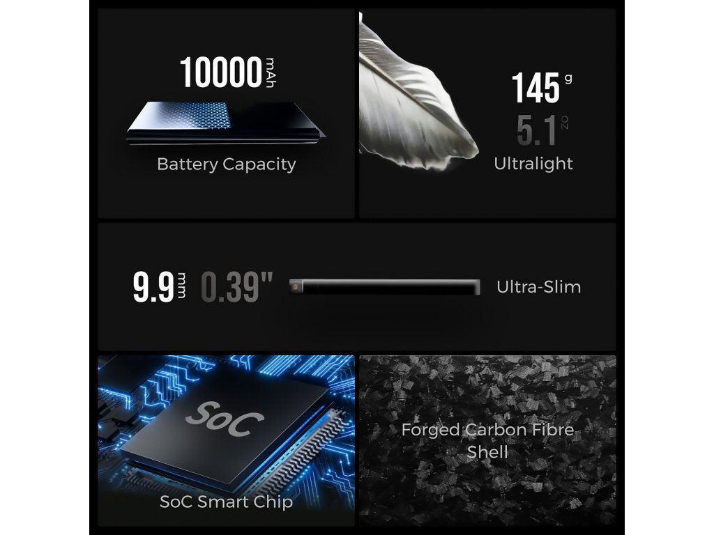 - Extrémní lehkost a kompaktnost: S hmotností pouhých 145 g a tloušťkou 9,9 mm je výrazně menší než standardní powerbanky stejné kapacity.