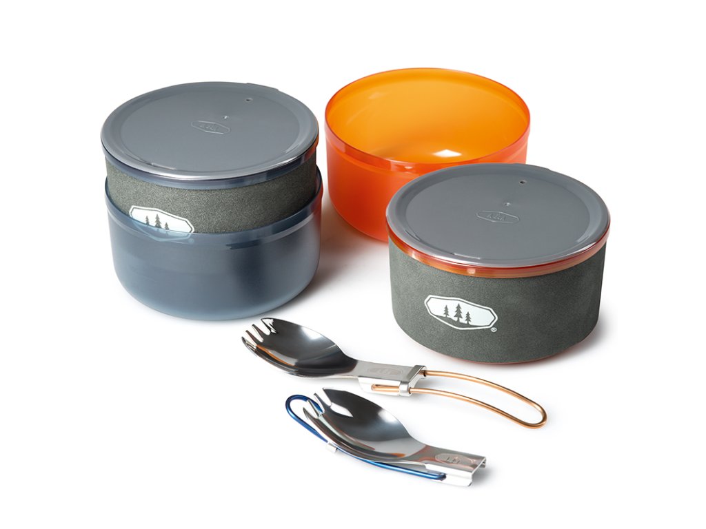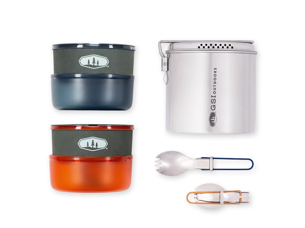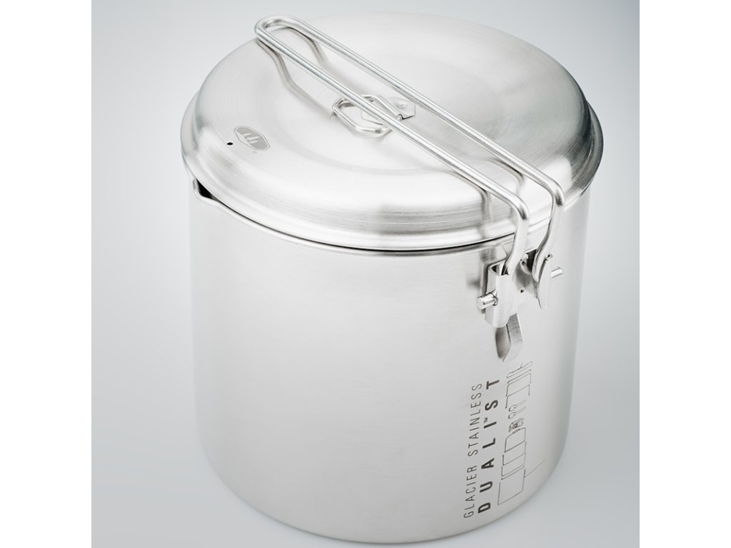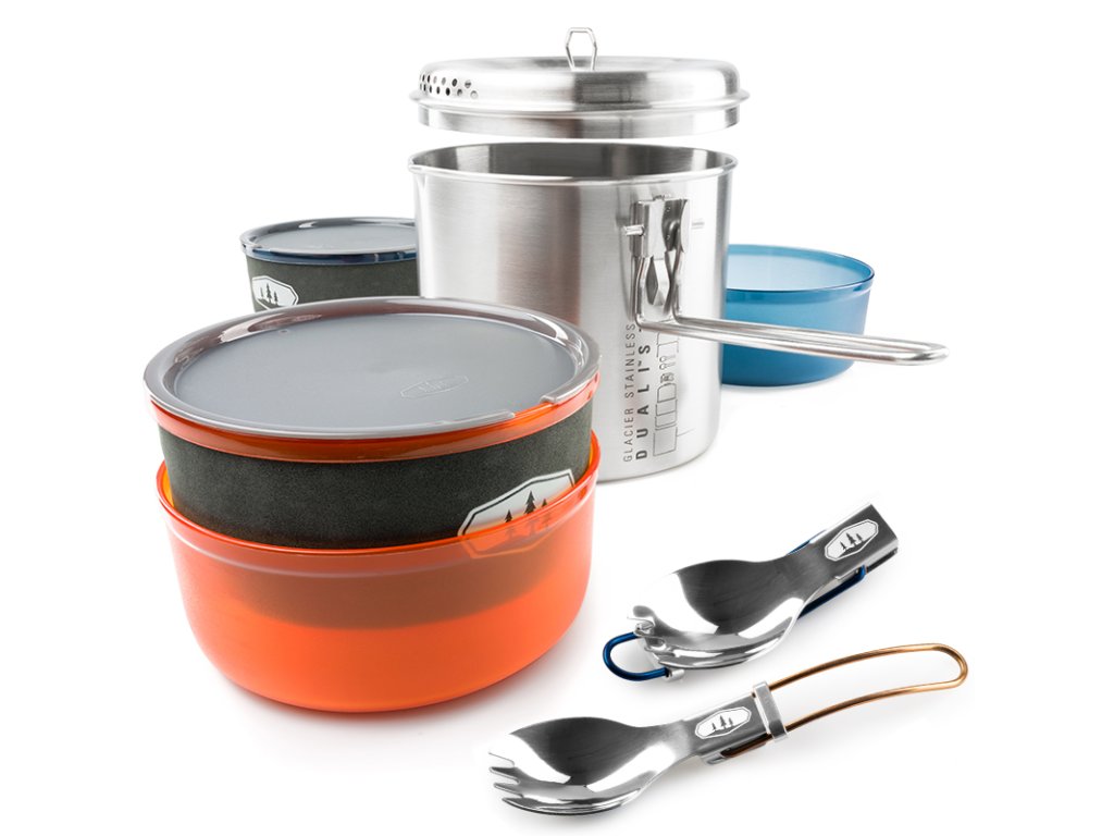 Glacier Dualist je sada nádobí pro 2 osoby s hlavním 1,8l rendlíkem z vysoce kvalitní nerezové oceli Glacier Stainless. Součástí sady jsou 2 misky, 2 hrnky s děrovaným víkem pro pití, 2 skládací lžícovidličky, perforovaná poklička pro scezení vody a obal na celou sadu, který slouží jako nádoba na vodu nebo umyvadlo. Celá sada se dá do hlavního rendlíku složit tak šikovně, že zbude místo i na plynovou kartuši GSI Isobutane Fuel 230 g a plynový vařič GSI Pinnacle Canister Stove, které však nejsou součástí sady.