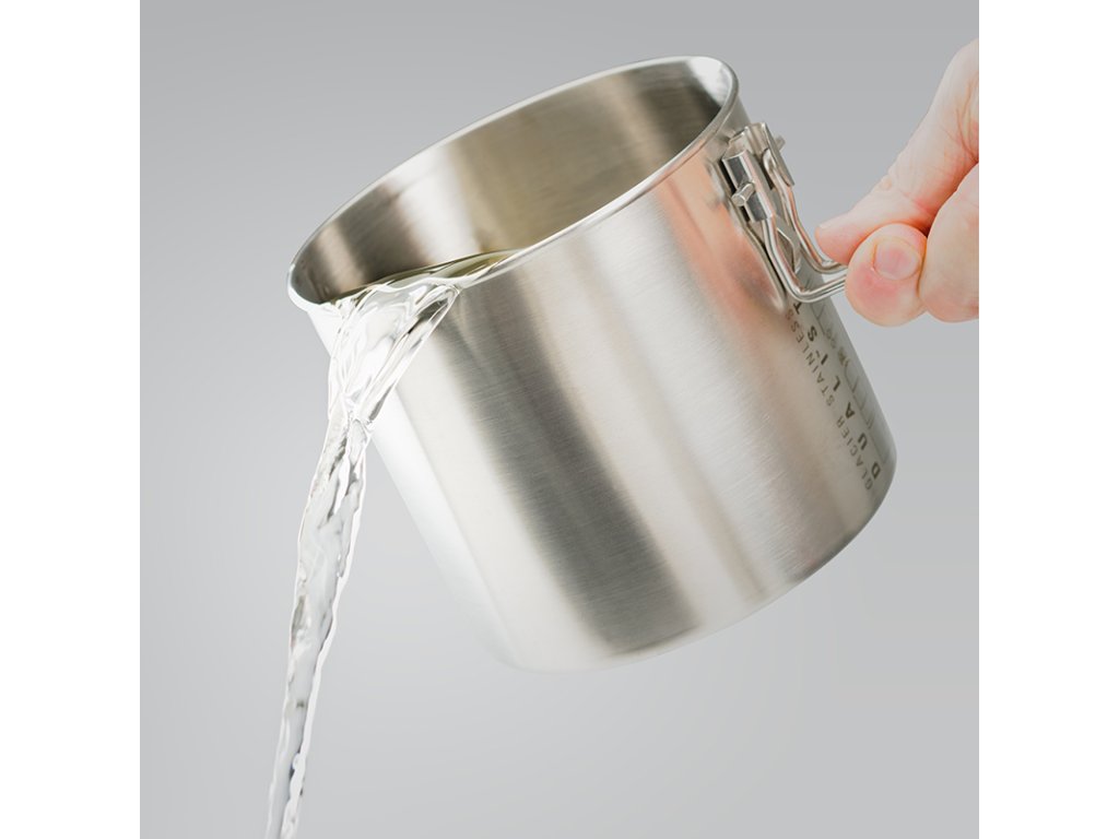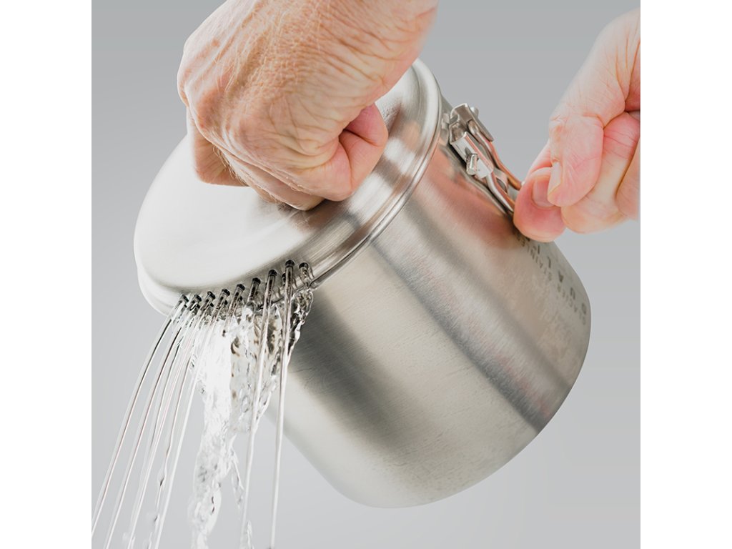 Z dalších výhod této kompaktní sady rozhodně oceníte vyraženou vnitřní stupnici objemu na rendlíku nebo sklápěcí rukojeť, která po sestavení slouží jako zámek celé sady.